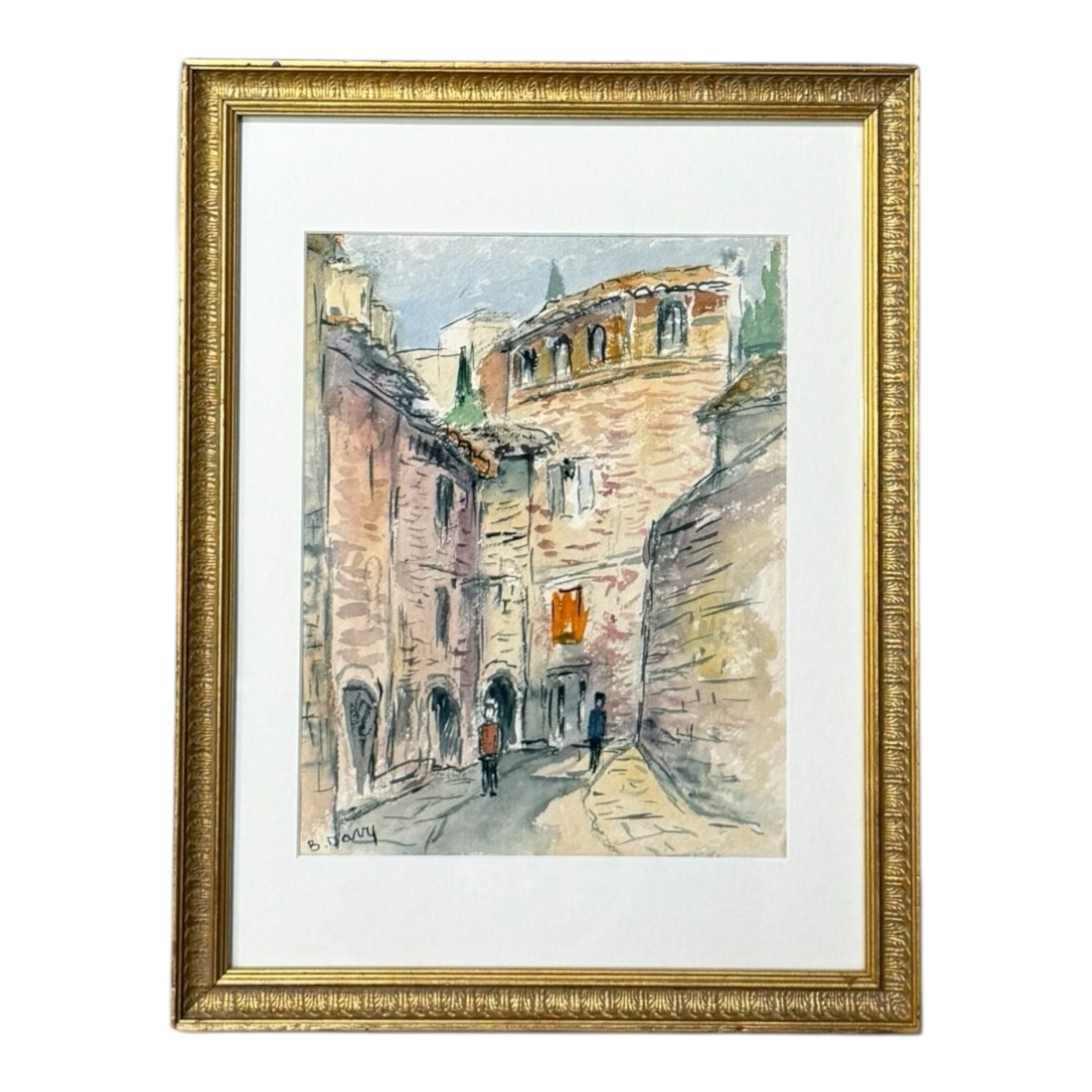This watercolor by French artist Bernard Davy captures a European street scene, likely in France, drawing inspiration from Impressionism to bring vibrant life and charm to your space. Circa mid-20th century. Presented in an antique wood frame with glass.