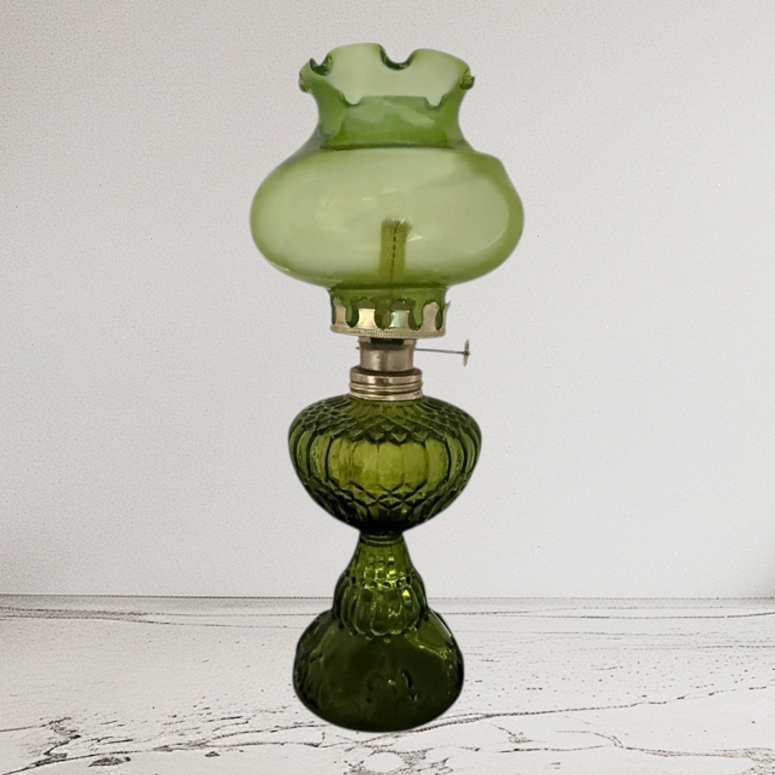 This vintage oil lamp is a true collector's item, boasting a unique "boopie" bubble pattern in stunning emerald green glass. The lamp's decorative fluted glass globe and base add to its charm, making it a perfect addition to any vintage home decor.