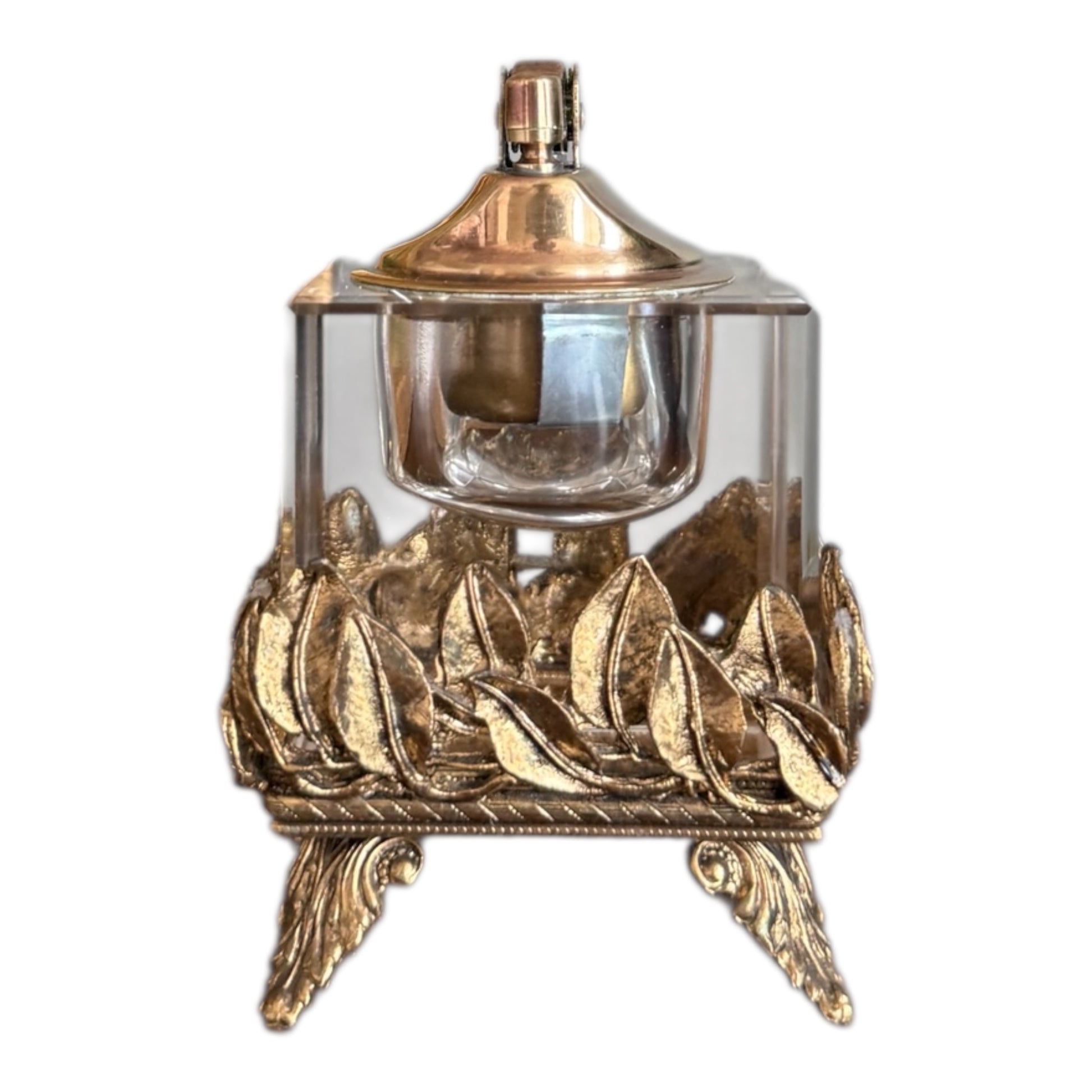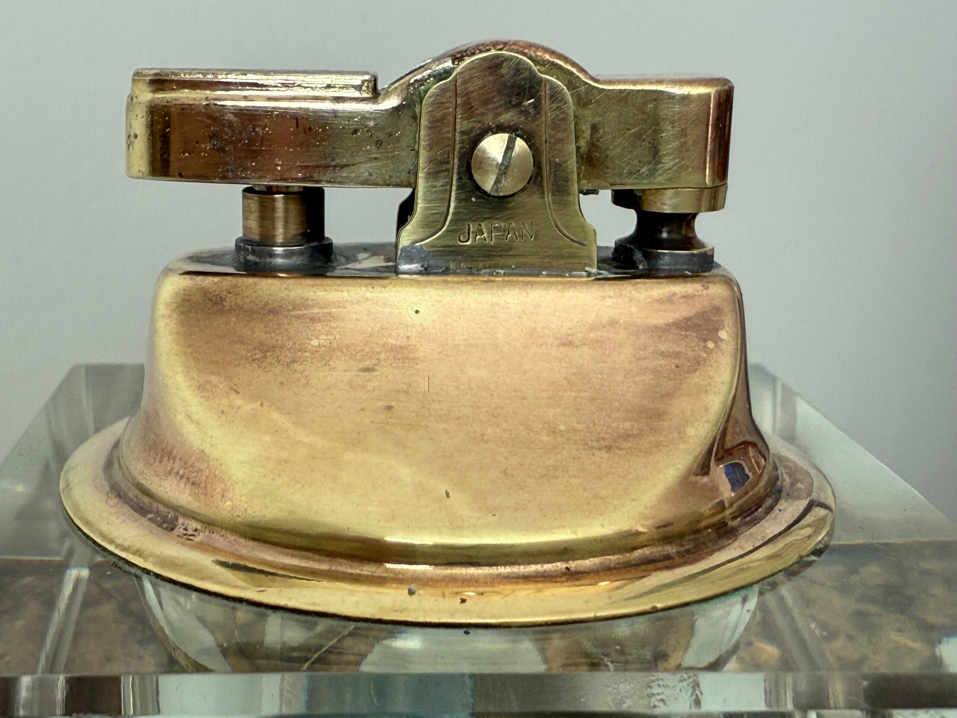 This vintage 1950s table lighter showcases Hollywood Regency elegance with its brass base and removable clear lighter. Fully functional, it adds a touch of classic charm to any setting.